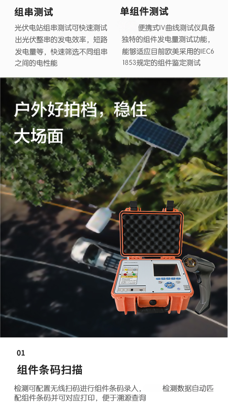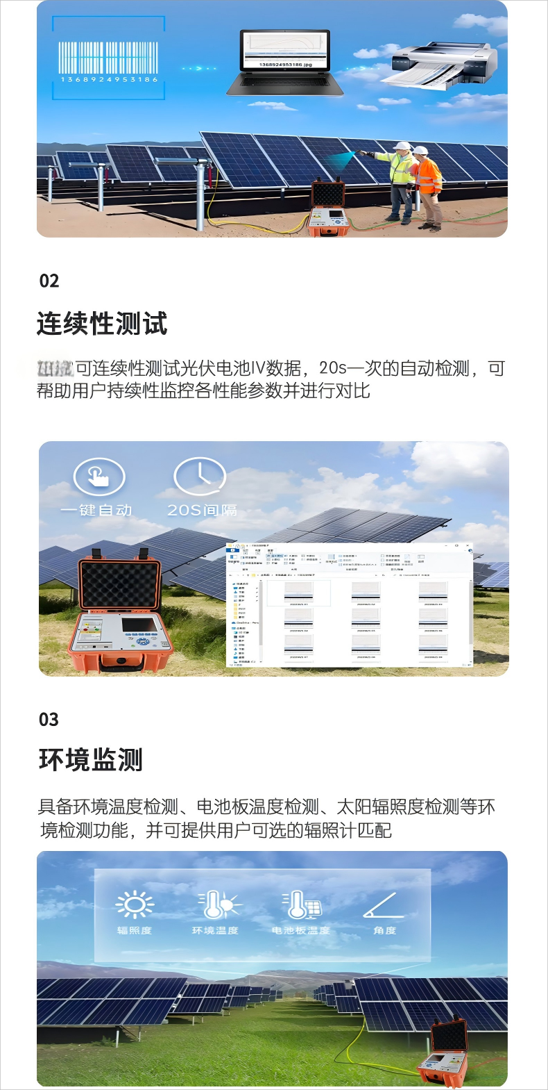 伏準計量光伏iv曲線測試儀廣泛應用于光伏電站的建設驗收、定期性能評估、系統效率排查及故障精準定位等環節,為運維團隊提供實時、準確的性能數據支撐,是提升電站發電效益、實現精細化運維管理的專業化工具。